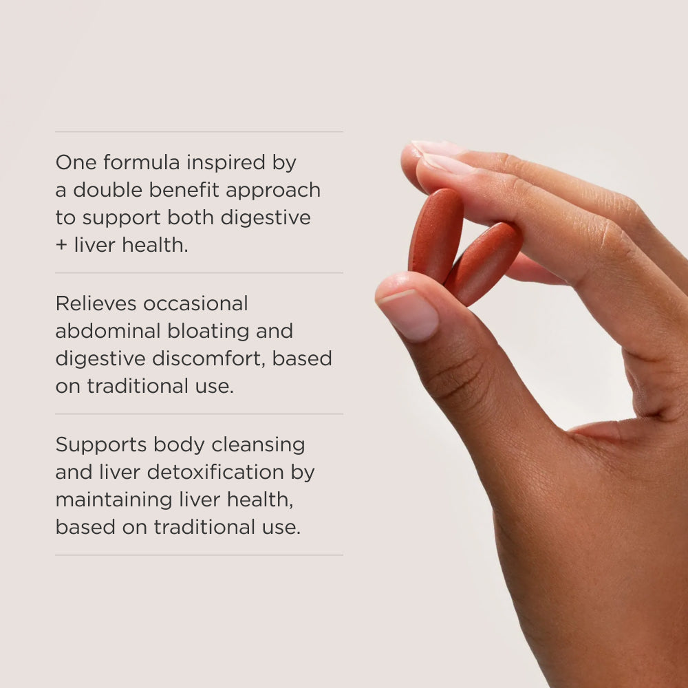One formula inspired by a double benefit approach to relieve abdominal bloating† and digestive discomfort, while supporting liver detoxification and cleansing.