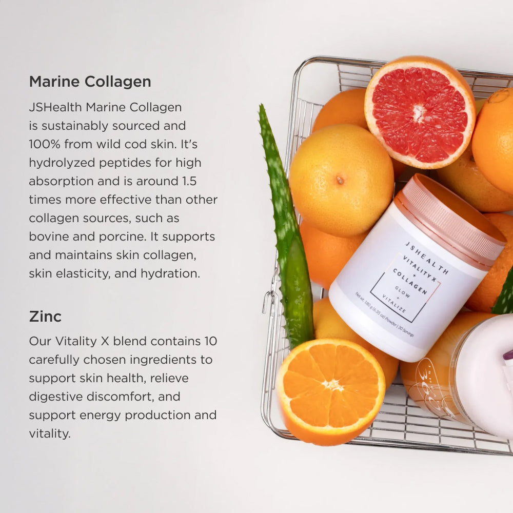 Say goodbye to fine lines and wrinkles with Vitality X + Collagen, our signature all-in-one inner beauty powder. This blend harnesses the benefits of sustainably sourced Marine Collagen (100% pure from wild cod skin) enhanced with clinically evaluated ingredients to support skin firmness, skin elasticity, and skin hydration in females.*