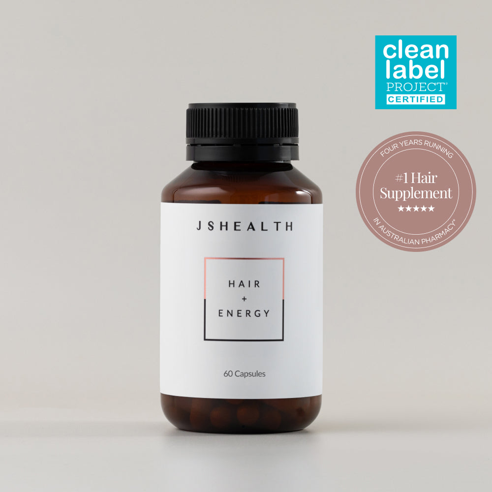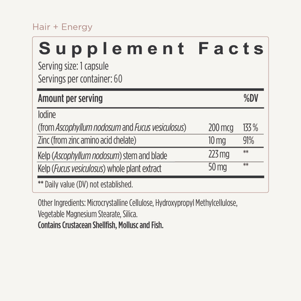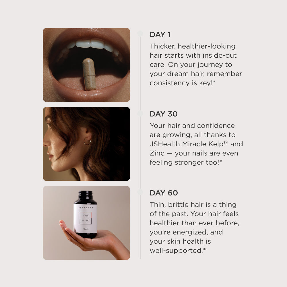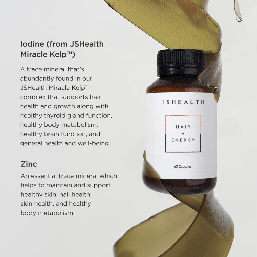 Created by the leaders in ingestible haircare, Hair + Energy supports hair health and growth, plus maintains energy levels, with Iodine from our exclusive blend of JSHealth Kelp™ and Zinc. It also maintains hair thickness and strength.* Because stronger hair starts with inside out care.