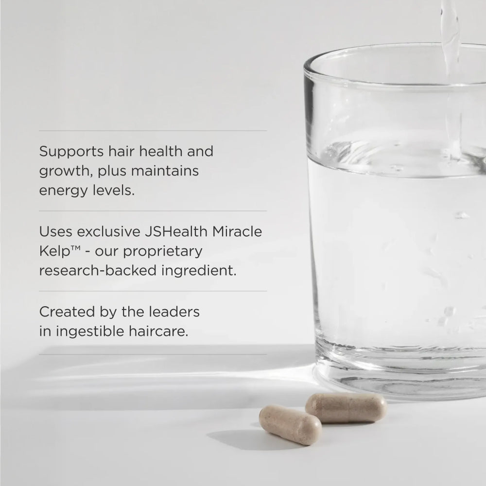 Achieve thicker, stronger, healthier-looking hair with our global best-selling ingestible formula starring Iodine from exclusive JSHealth Miracle Kelp™ along with Zinc. All in just one capsule a day.