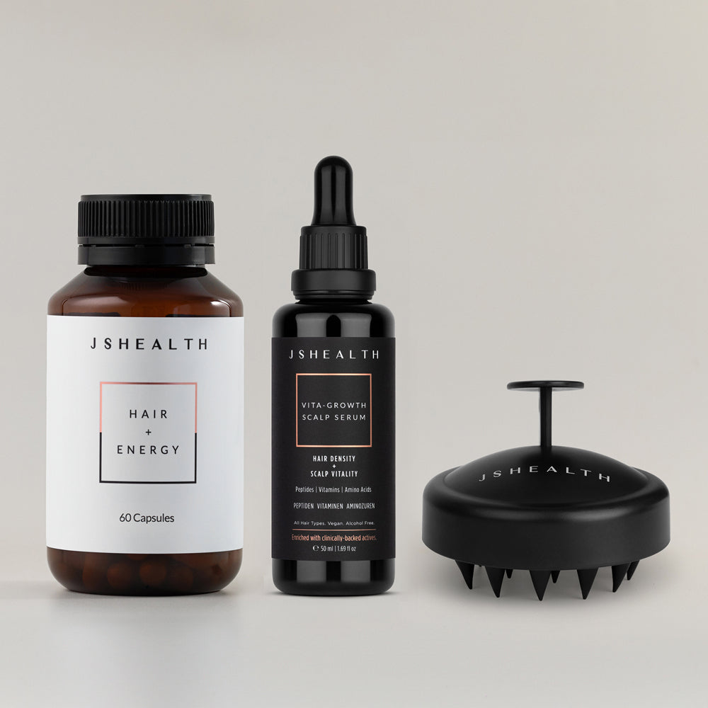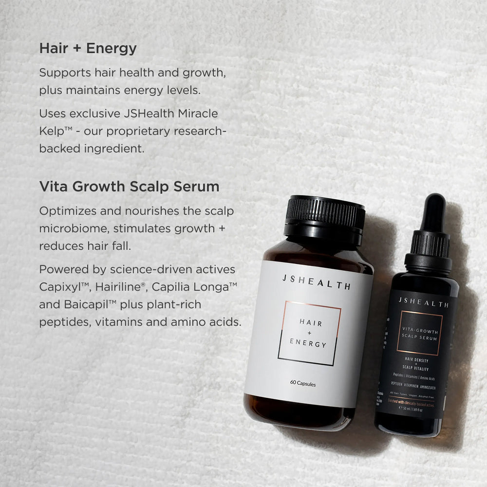 - This bundle includes 60 capsules of Hair + Energy (a 2 month supply), a 2 month supply of scalp serum (50 ml | 1.69 fl oz), and one Scalp Brush.