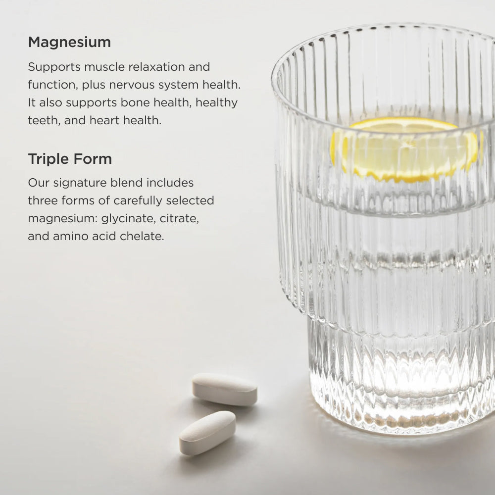 Our best-selling, signature triple form Magnesium. Formulated with Magnesium Glycinate, our blend supports muscle relaxation and function, nervous system health, plus bone health, and density.