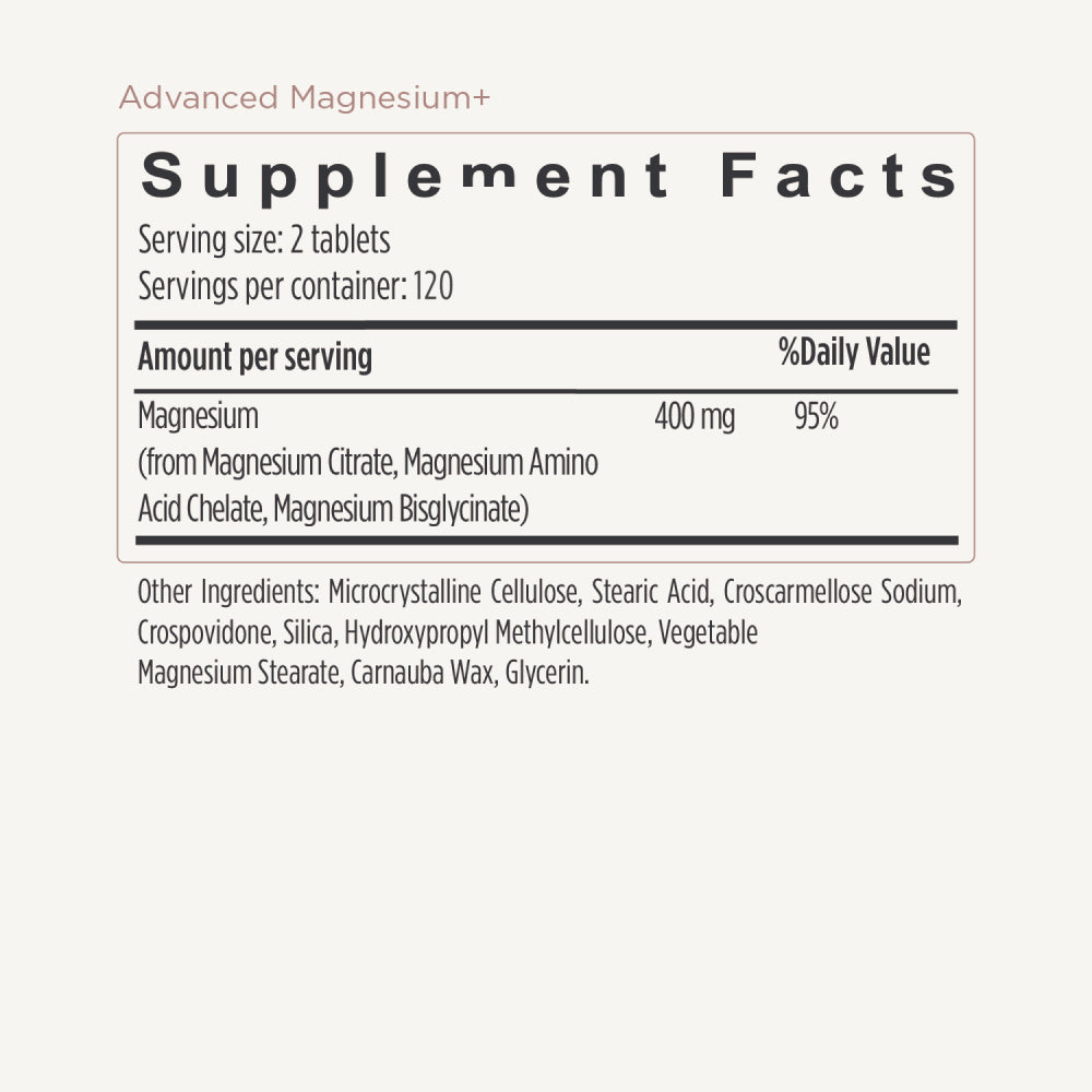Advanced Magnesium+ contains three forms of Magnesium in a formula carefully designed for absorption. Discover relaxation and restoration in just 2 tablets a day.