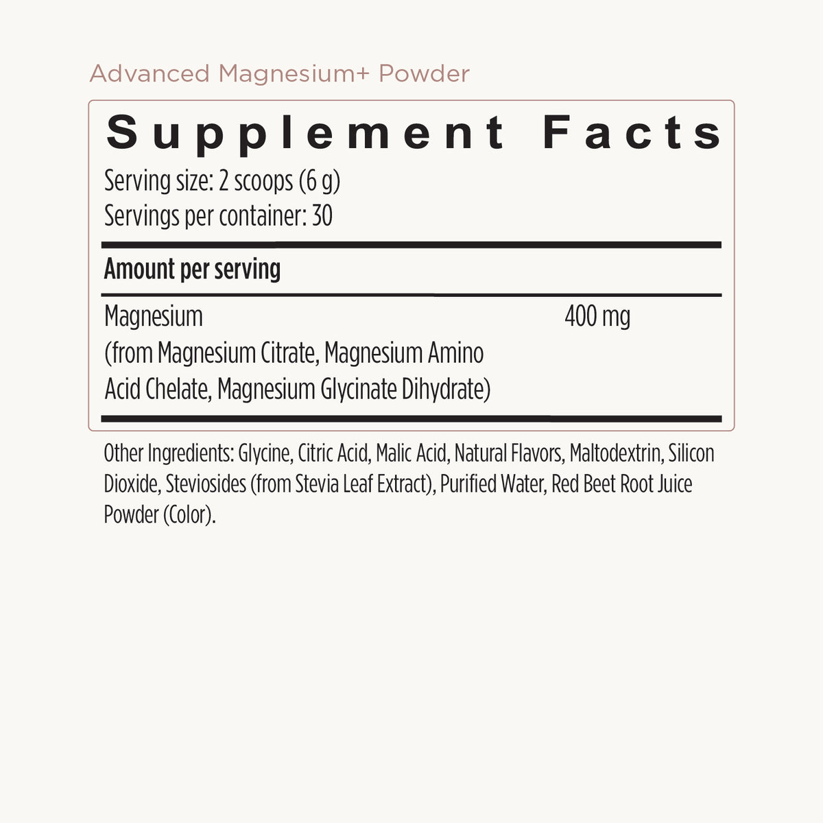 - High-strength 400mg dose of Magnesium per serving